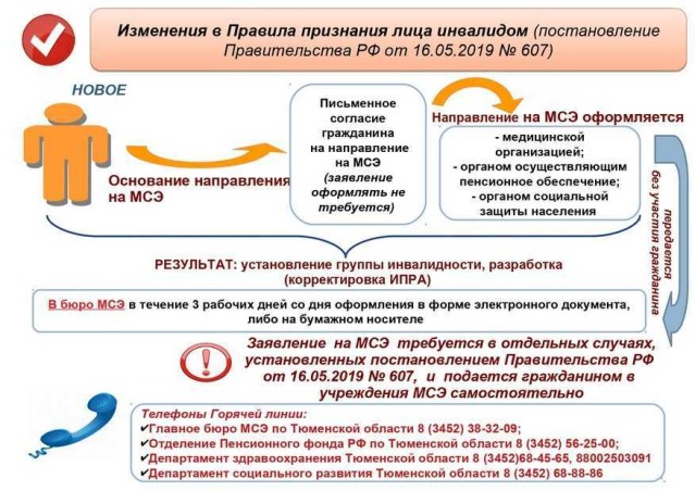 Постановлением Правительства РФ от 16.05.2019 № 607 «О внесении изменений в Правила признания лица инвалидом» упрощен порядок направления граждан на медико-социальную экспертизу и проведения медико-социальной экспертизы.